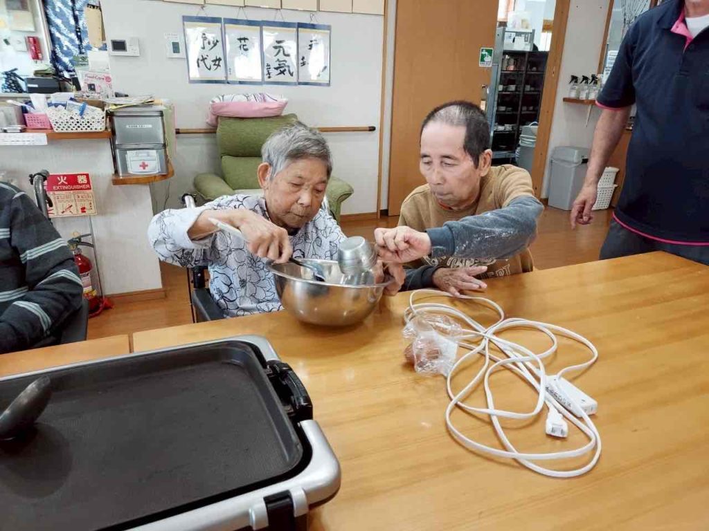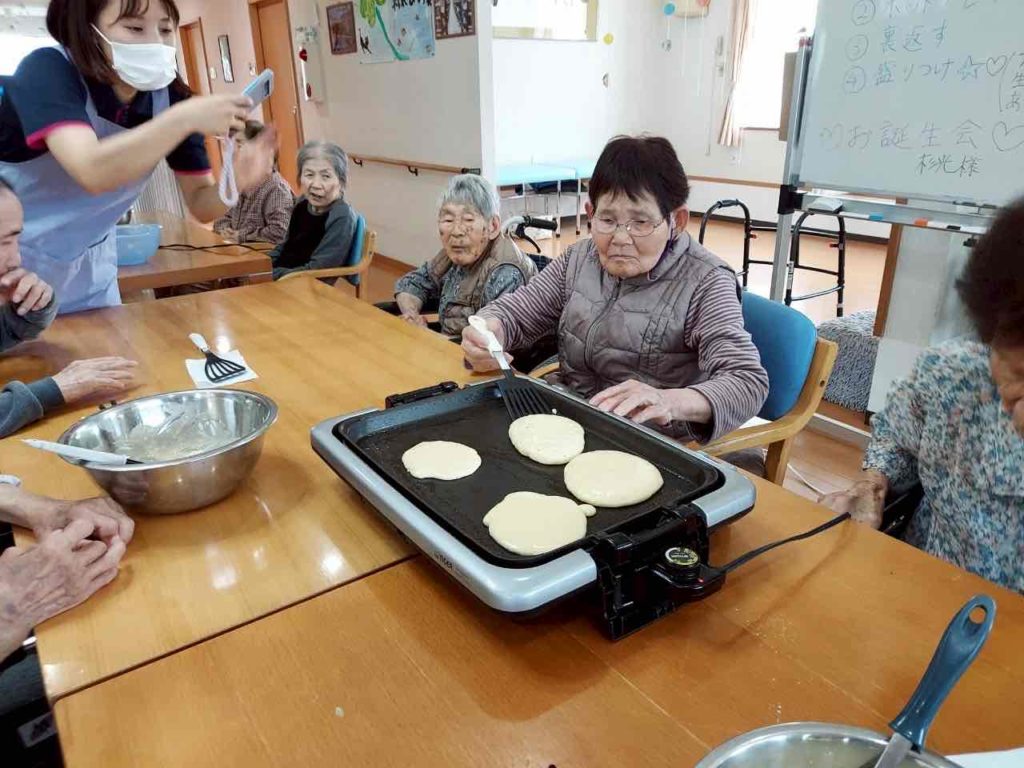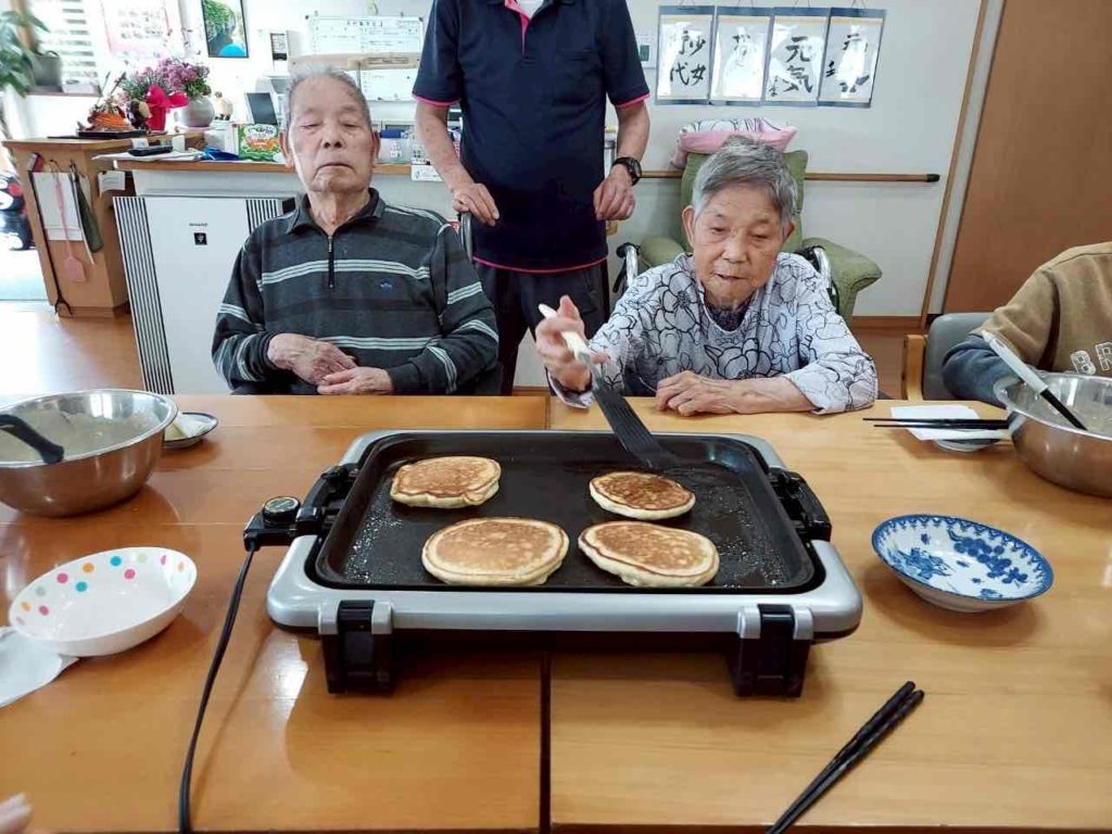 今月は、利用者様に手作りホットケーキを作っていただき、好みに合わせて、ホイップクリーム・果物などを利用者様ご自身でトッピングして頂きました。